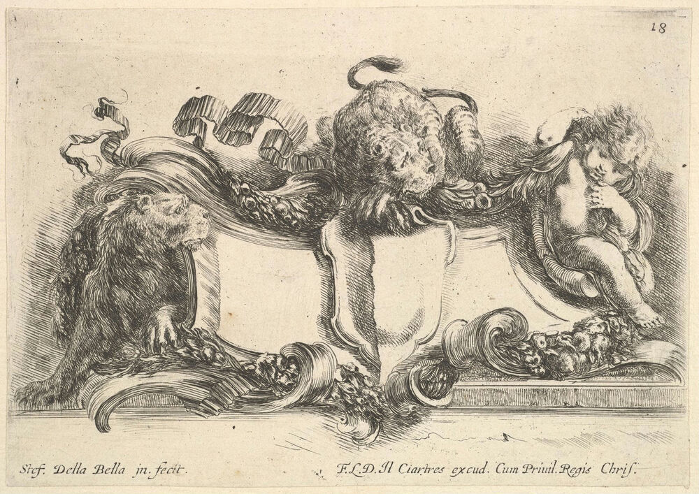 Plate 18: a cartouche containing an empty crest, two lionesses, one to left and one in center, an infant to right, from 'Collection of various caprices and new inventions of cards and ornaments' (Raccolta di varii cappriccii et nove inventioni di cartelle et ornamenti)