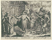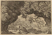 A gentleman wearing a plumed hat and carrying a sword, seen from behind, his right arm outstrestched, a landscape in the background with houses and a tower